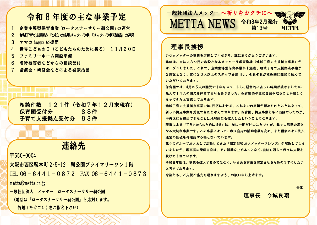 法人のニュースレター「メッターニュース13号」 を発行しましたので、ご高覧ください